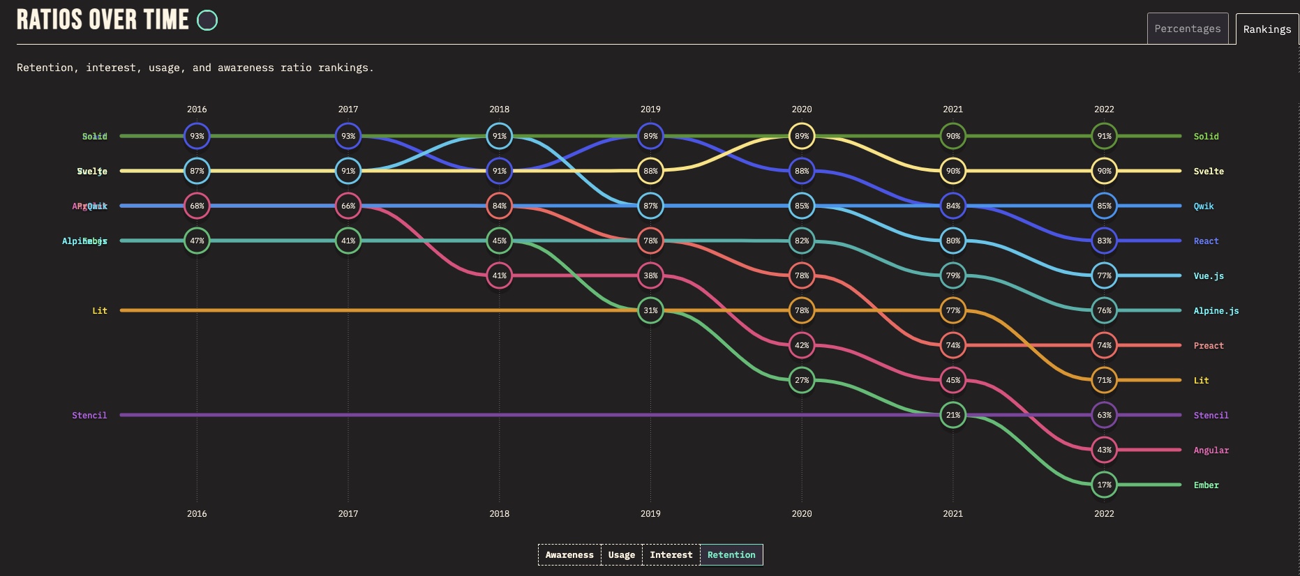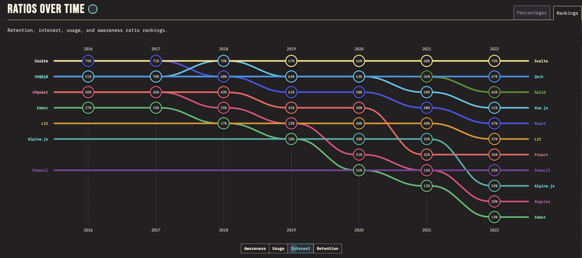 1위는 Svelte로 70%를 기록했다. 2위는 Qwik으로 67%, 3위는 Solid 66%, 나머지 React, Vue, Angular의 관심도는 지속적으로 하락하고 있다.