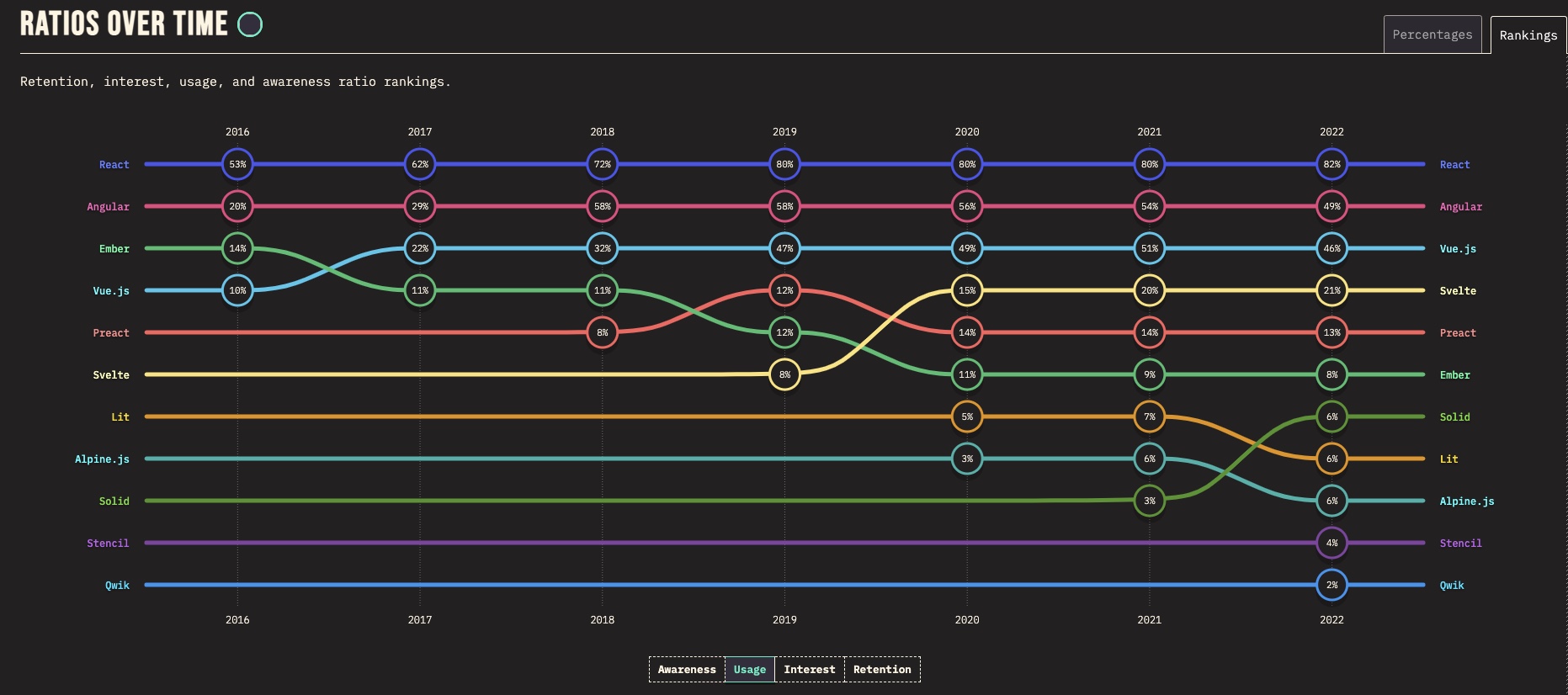 사용률에서는 React가 82%를 차지하며 꾸준히 압도적으로 1위 자리를 지키고 있다.